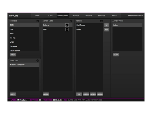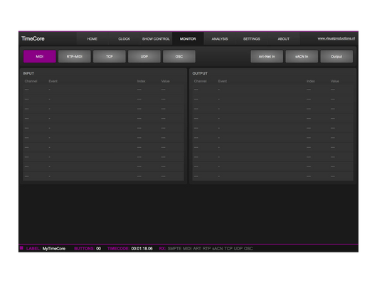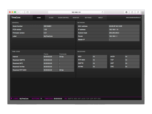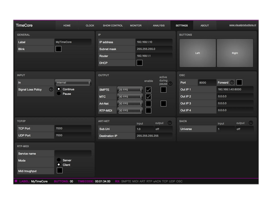 타임코어에는 내부 웹서버에 접속할 수 있는 이더넷 포트가 있다. 이 웹 서버를 사용하면 장치의 동작을 완전히 구성할 수 있다.예를 들어 UDP, TCP, OSC, MIDI와 같은 쇼 컨트롤에서 자주 발견되는 다양한 프로토콜이 지원된다. 이러한 프로토콜로부터 수신된 모든 메시지는 타임코드를 시작, 중지 또는 조작하는 데 사용될 수 있다. 또한, 타임라인에 매핑된 이 프로토콜들을 전송한다..
